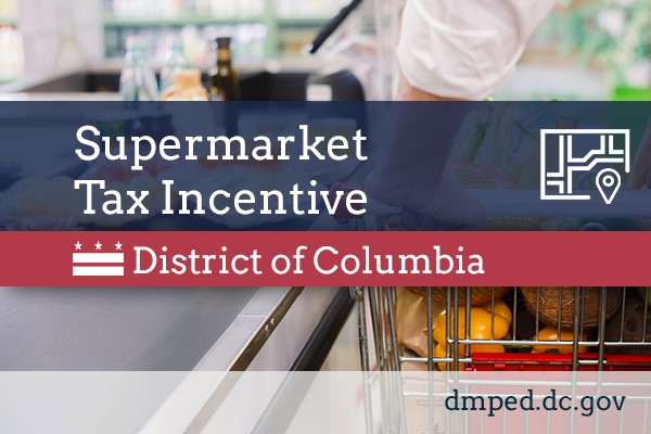 Description: Through the Supermarket Tax Exemption Act of 2000, the District waives certain taxes and fees to grocery stores that locate in specific neighborhoods. The incentive encourages development and investment in areas lacking access to groceries and fresh food. Qualifying supermarkets may be eligible to receive one or more of the following benefits for up to 10 years after development or renovation. Real property tax exemption; Business license fee exemption; Personal property tax exemption; Sales and use tax exemption on building materials necessary for construction. More information at https://dmped.dc.gov; search supermarket tax incentive.