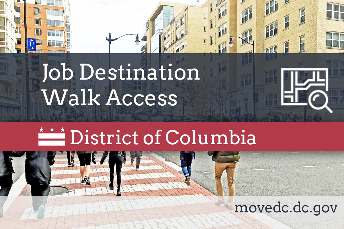 Description: This layer considers jobs and destinations to be accessible by walking if the destinations are reachable within 20 minutes. Access to jobs and destinations within a fixed time is measured using the actual networks and not a straight line distance. Destinations include grocery stores, hospitals, community services, education centers, and other significant community areas. Jobs across the region (not just within the District) were used to provide a full picture of employment access.