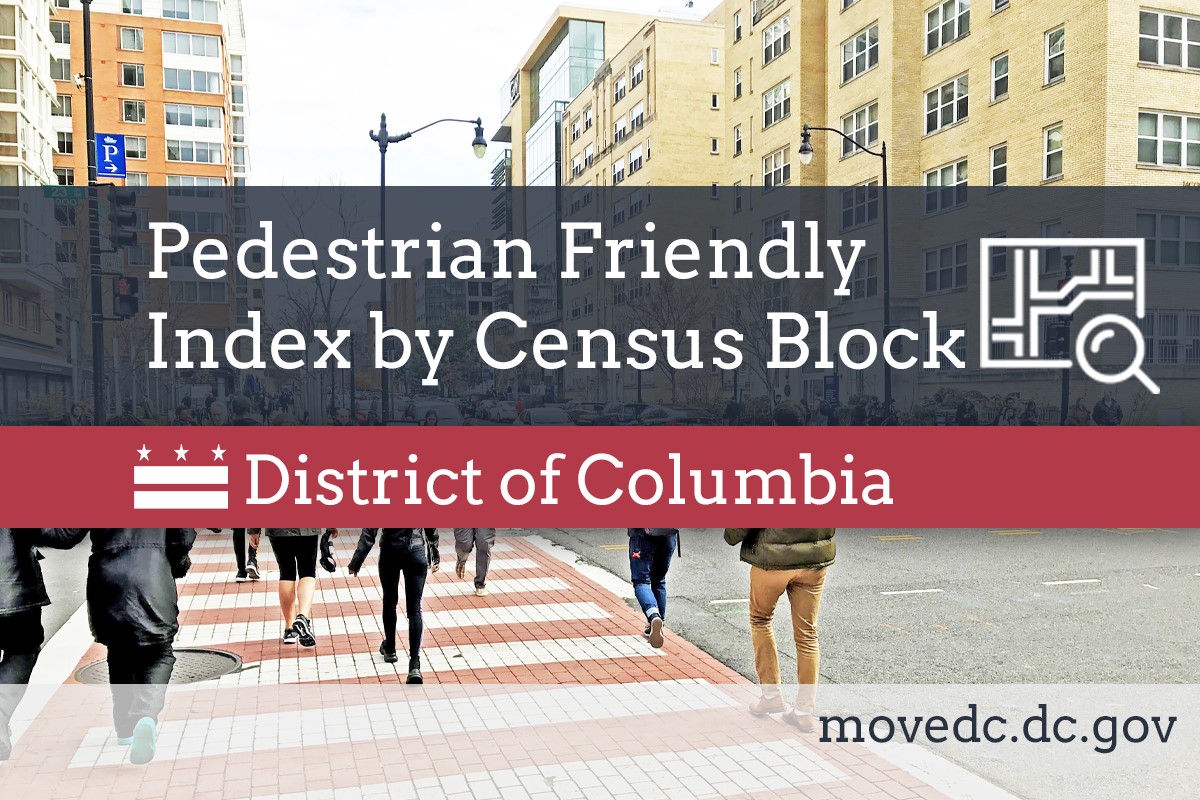 Description: The Pedestrian Friendliness Index (PFI) scores for each Census block showing how walkable they are, relative to other Census blocks in the District. An area deemed ‘most walkable’ has a connected street grid with sidewalks, buildings set close to the street, and intersections and blocks that are manageable for pedestrians.