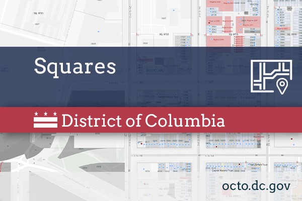 Description: Squares are calculated by the outer extents of the record or tax lots within a defined area (typically a city block). There are roughly 4896 active squares. A Square is similar to a city block. Squares were numbered starting at 1 and are currently in the 6000 series. Not all squares are active. A common cause of squares becoming inactive has been through street closing and combining squares. When the squares are combined usually the lower square number is killed and the higher square number is used for the combined square. For example if squares 1 and 2 are combined, square 1 is killed and the combination becomes square 2.Spatial locations:Each Square is an Island, alone unto itself. There is not now, and has never been, any citywide Survey Coordinate System in D.C. Most squares are unrelated to other Squares by “Measured.” They are related by Record. Street width is approximate. You cannot rely on the published official street widths to set up property lines or determine right-of-way. There is digital scan information available from DDOT regarding Right-of-Way. Some Squares are divided by streets. That is, the same Square continues on the other side of the street. Since there is no citywide Survey Coordinate System, squares were placed in their approximate location. This process is known as “best fit”.