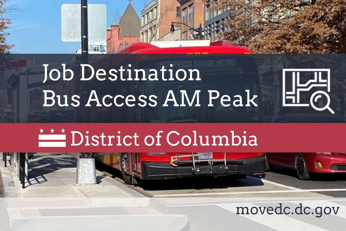 Description: This layer considers jobs and destinations to be accessible by bus if the destinations are reachable within 30 minutes. Access to jobs and destinations within a fixed time is measured using the actual networks and not a straight line distance. Destinations include grocery stores, hospitals, community services, education centers, and other significant community areas. Jobs across the region (not just within the District) were used to provide a full picture of employment access.